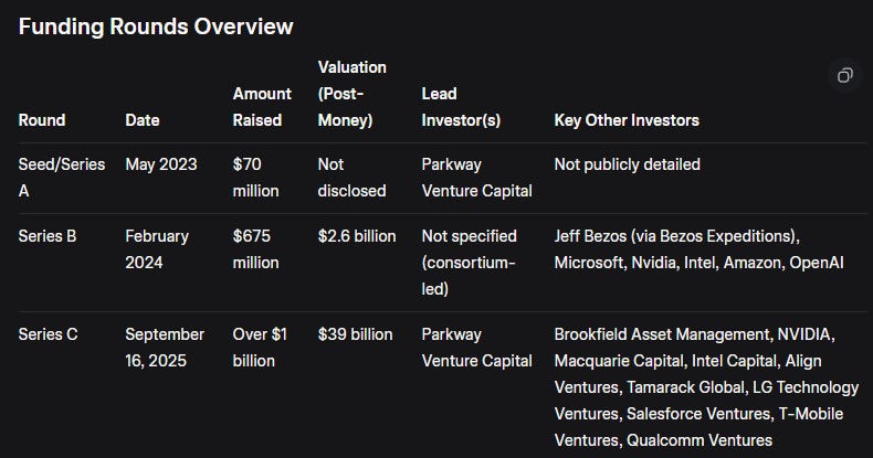 Funding History: Raised $675 million in Series B in 2024 at a $2.6 billion valuation, backed by investors including Microsoft, Amazon's Jeff Bezos, NVIDIA, and Intel Capital.
